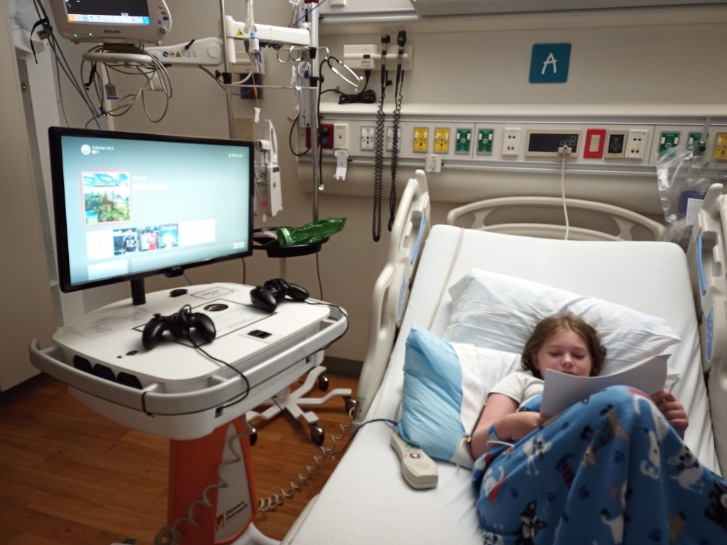 By day 7 Rachel was starting to feel better but they still did not have a diagnosis and they decided to get an MRI. Although she was too sick to use any of it until the last couple of days, there were video games, movies, games and art supplies available on the unit: