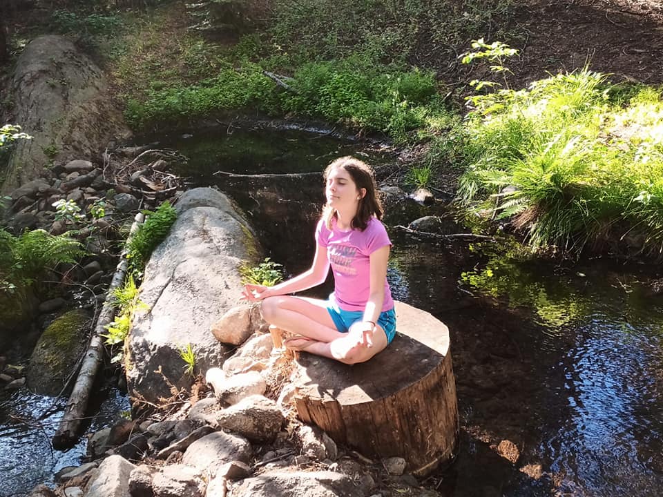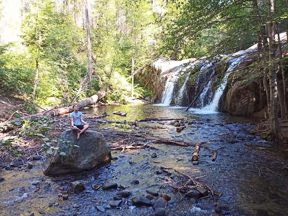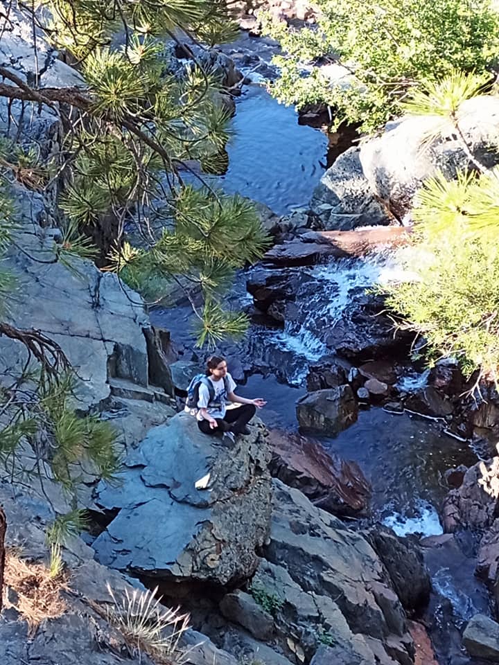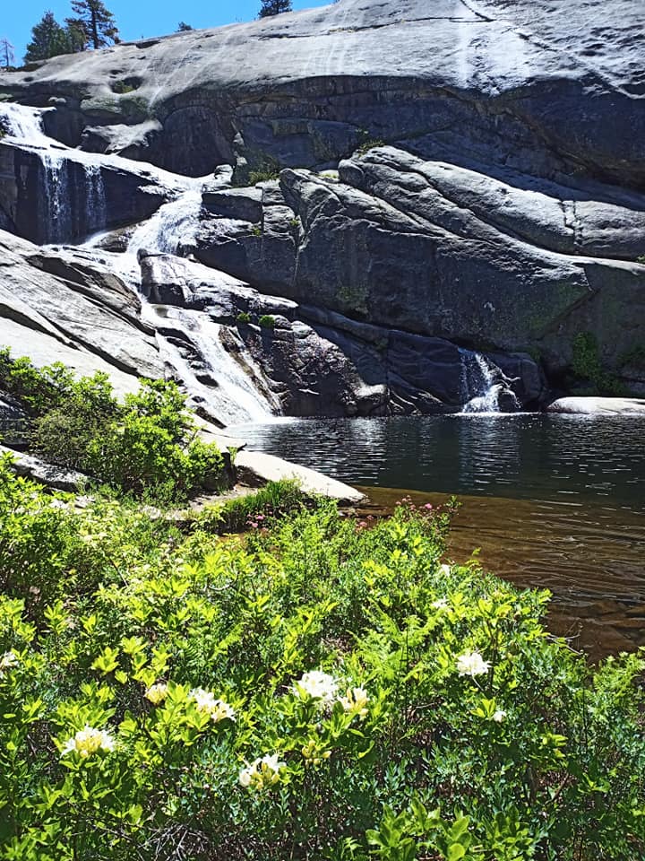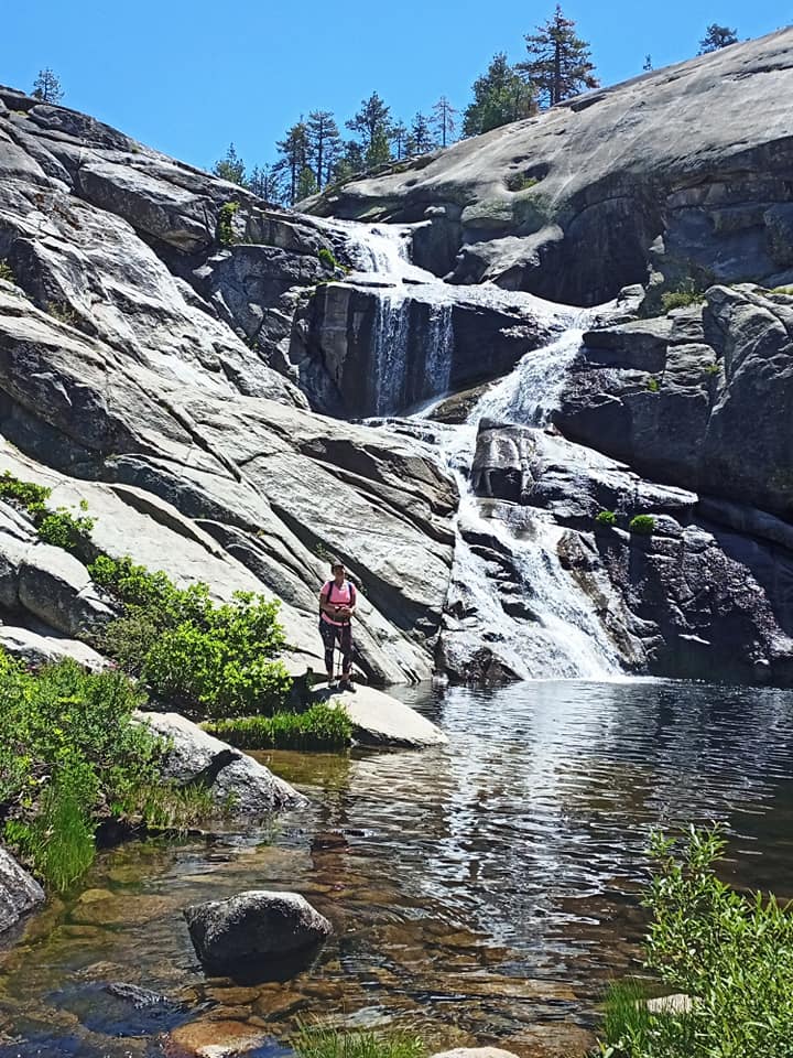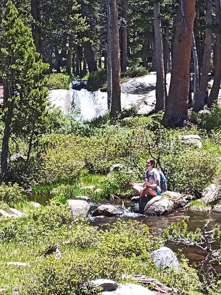 A nice waterfall, wildflowers, and a Zen pose to match on the way to the last lake.