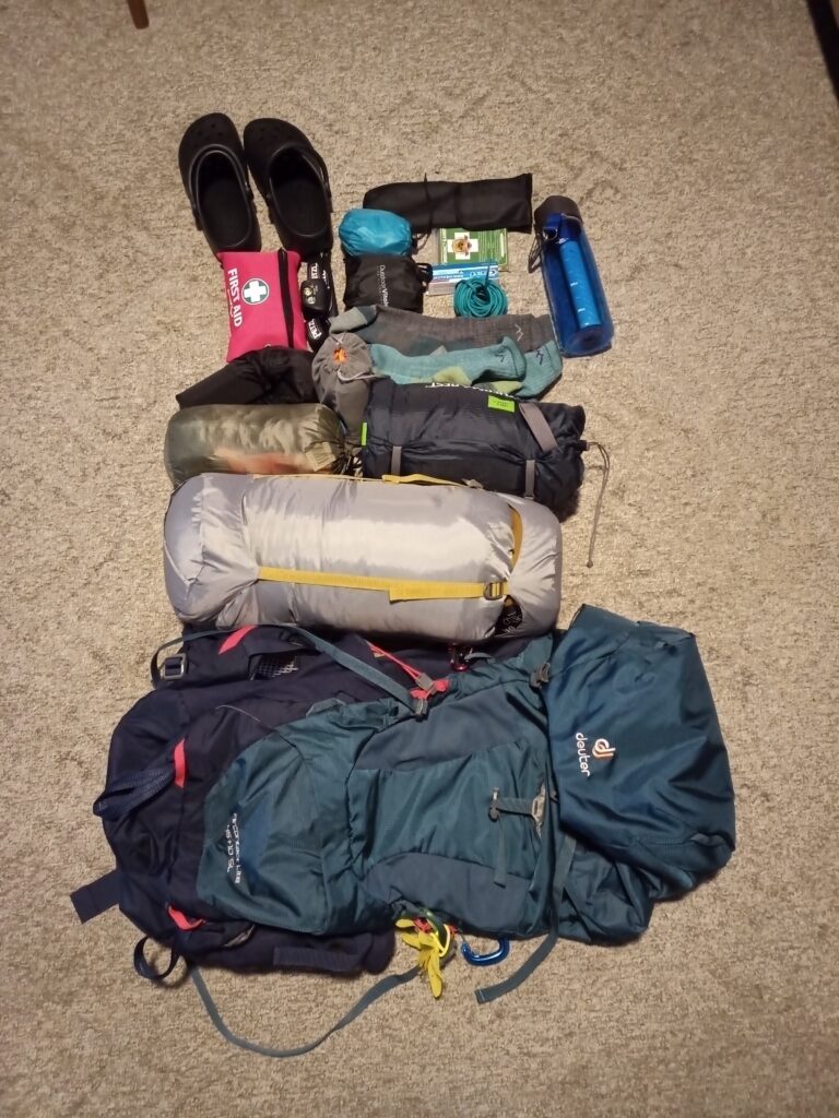 Mom and Dad wanted to test out their backpacking gear before they actually go on a big overnight hike. So they gathered all their gear and backpacks: