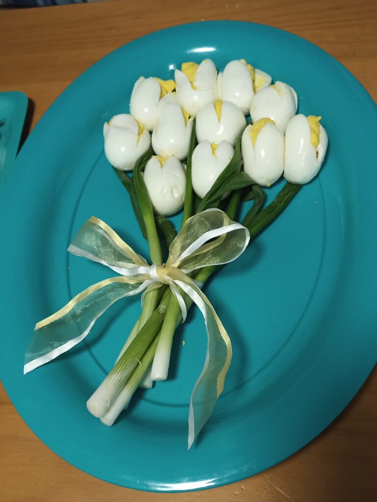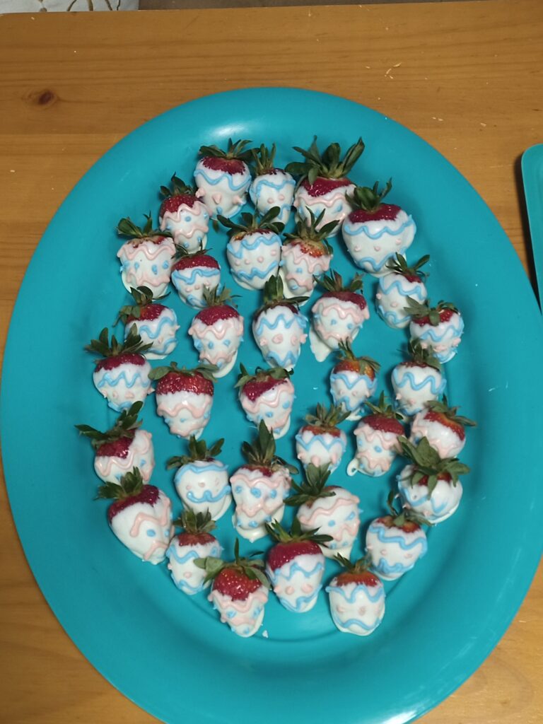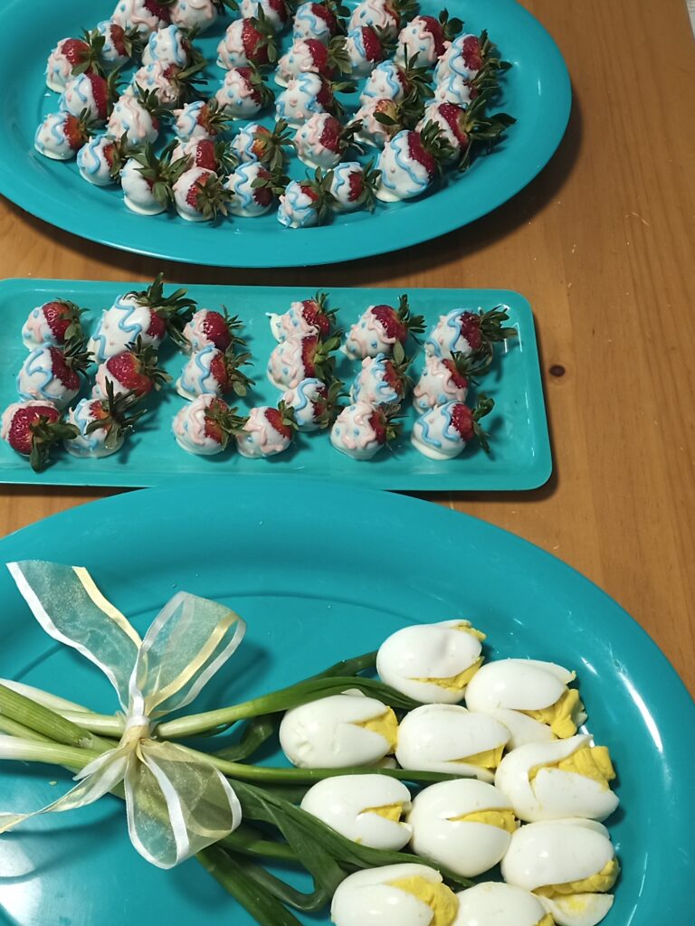We were invited to the Fleshners house for Easter dinner (Mom’s friend Dimple and Lizzy’s friend Mira). We made these fancy deviled eggs and white chocolate covered strawberries: