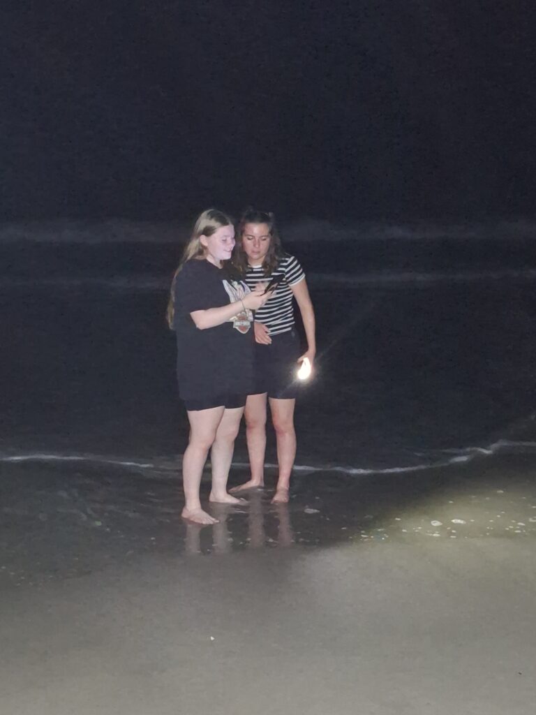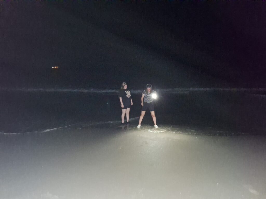 On the beach in the dark (picture in your mind the sand and water)!