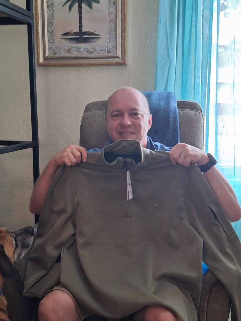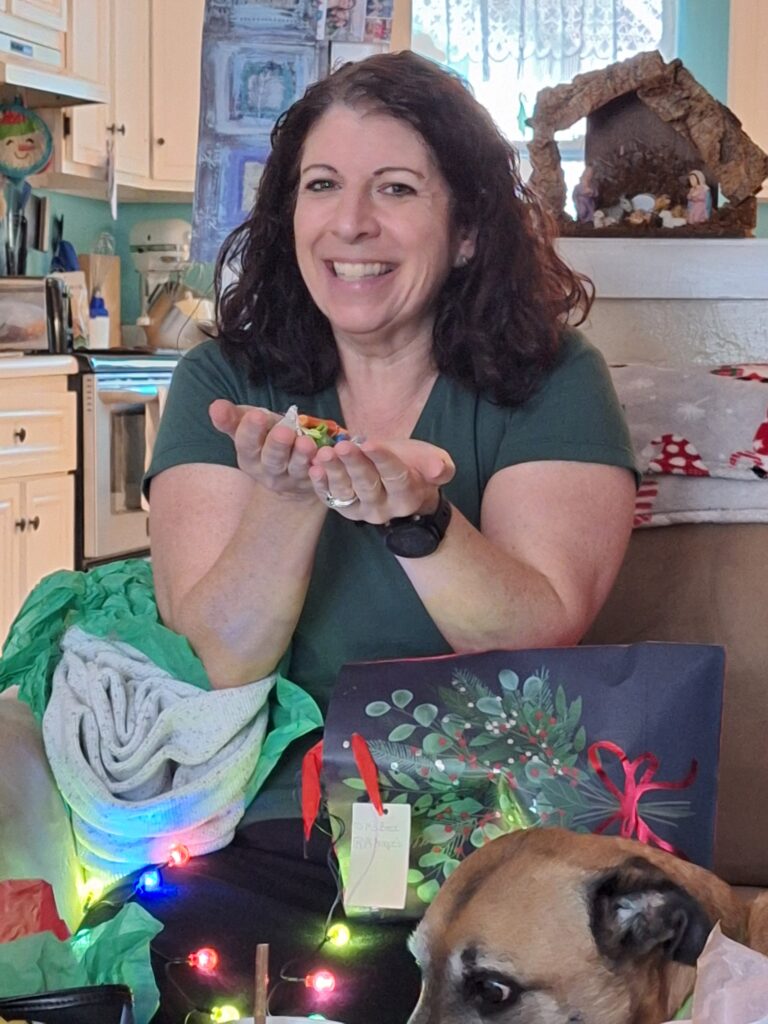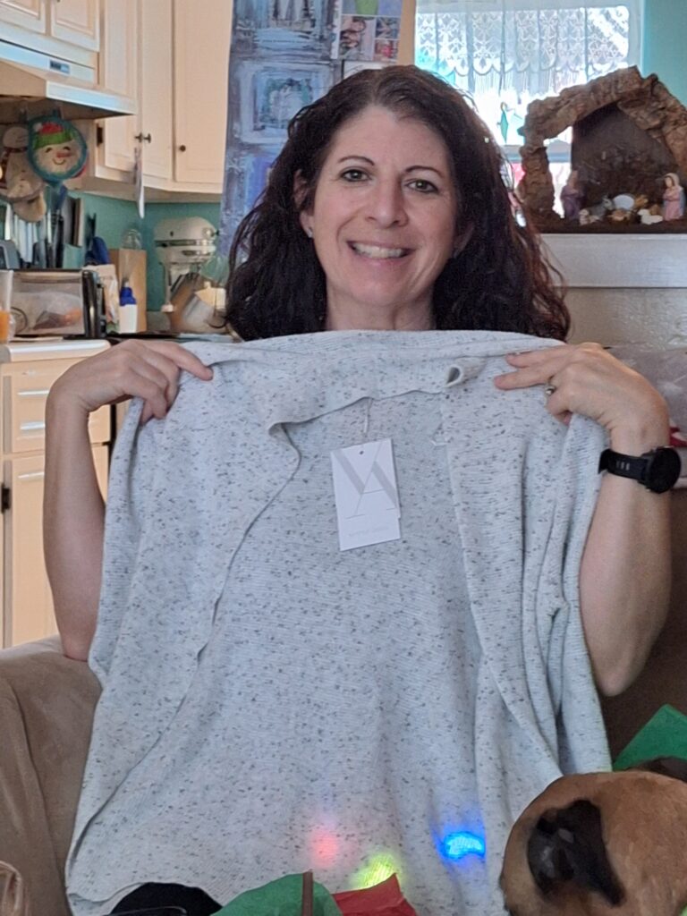 They like to put sweet treats in their gift bags!A purse and a sweater!Lots of candies in the bag along with…A sweater.Very nice!Nice for our NY trip!Sweet treats.Soft and Cozy!
